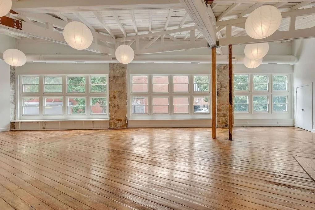 Gallery space includes 36 ft x 28 ft open space, additional full kitchen, 10 ft x 10 ft, two restrooms. Adjacent on-street and Omni garage parking available. Newly remodeled for your beautiful event in our historic carriage works loft. Second floor space, stairs-only access.