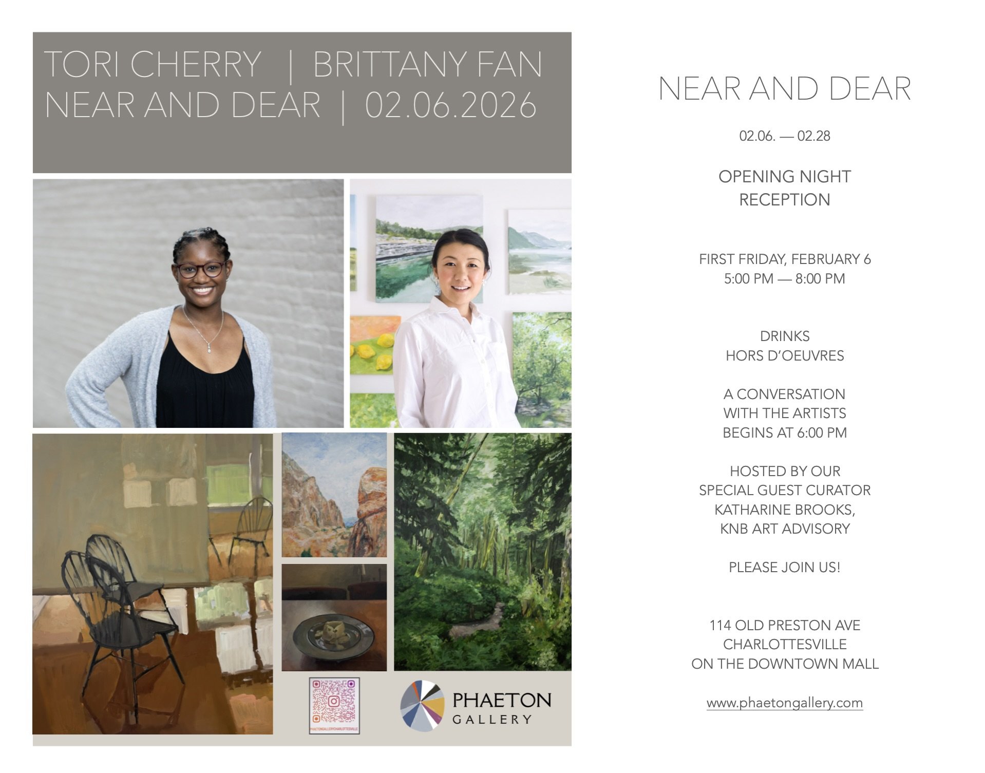 Join us for the opening night reception on Friday, February 6, from 5–8 PM at our Old Preston Avenue location in Charlottesville. A conversation with the artists begins at 6:00 PM.